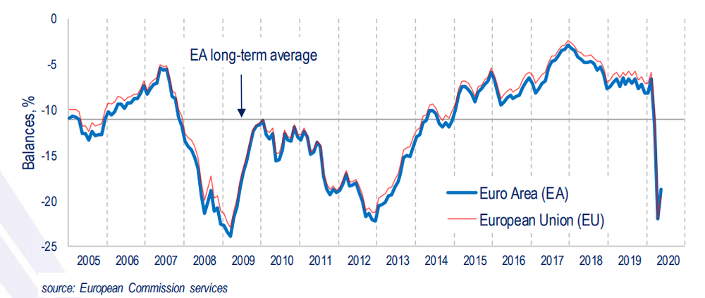 Стоит подчеркнуть, что как показатель для еврозоны, так и показатель для ЕС находятся ниже своих долгосрочных средних значений -11,1 пункта и -10,4 пункта соответственно.