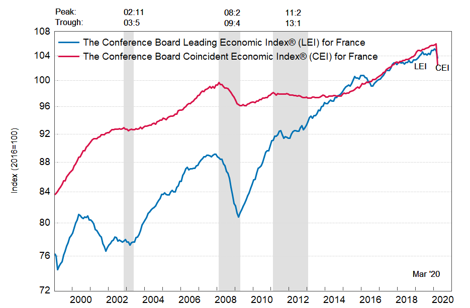 Результаты исследований, опубликованные Conference Board, показали: по итогам марта ведущий экономический индекс (LEI) для Франции упал на 1,2 процента, и составил 103,6 пункта (2016=100). Напомним, индекс зафиксировал снижение на 0,2 процента в феврале и повышение на 0,2 процента в январе. В течение шести месяцев (с сентября 2019 по март 2020 года) показатель упал на 0,8 процента после повышения на 0,8 процента за предыдущий шестимесячный период (с августа 2019 года по февраль 2020 года).