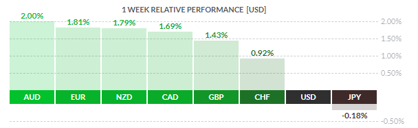 По итогам недели почти все основные валюты продемонстрировали повышение. Наибольший прирост по отношению к доллару США показал австралийский доллар (+2,00%). Меньшее падение зафиксировали евро (+1,81%), новозеландский доллар (+1,79%), канадский доллар (+1,69%), британский фунт (+1,43%) и швейцарский франк (+0,92%). Подешевела только японская иена (-0,18%).