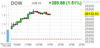Большинство компонентов DOW в плюсе (22 из 30). Лидер роста - The Boeing Co. (BA; +8.51%). Аутсайдер - Pfizer Inc. (PFE; -0.94%).