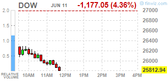 Основные фондовые индексы США демонстрируют снижение на 2.8%-4.4%, так как инвесторов обеспокоили пессимистические прогнозы ФРС и возможность второй волны заболеваемости COVID-19.
