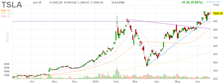 На текущий момент акции TSLA котируются по $1000.35 (+0.86%).