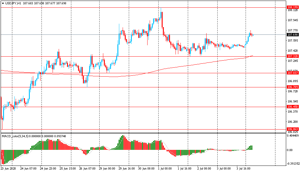 В пятницу пара USD/JPY торговалась разнонаправлено в узком диапазоне Y107.45-55 и закрыла день без существенных изменений. Сегодня пара немного выросла, поднявшись к отметке Y107.75. На часовом графике USD/JPY все еще торгуется выше линии скользящей средней МА (200) Н1 (Y107.30). На четырехчасовом графике ситуация аналогичная. Исходя из вышесказанного, вероятно, стоит придерживаться северного направления в торговле и пока пара остается выше MA 200 H1, необходимо искать точки входа на покупку на формирование коррекции.