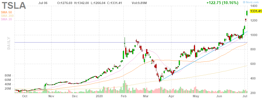 На текущий момент акции TSLA котируются по $1331.41 (+10.16%).