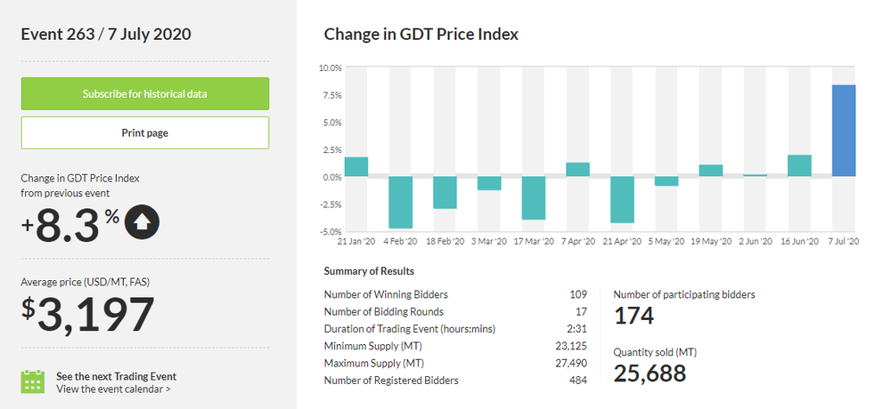 Как стало известно, стоимость молочной продукции повысилась на 8,3%, до $3 197 за метрическую тонну после того, как выросла на 1,9% в ходе предыдущего аукциона. Результаты аукциона также показали, что стоимость цельного сухого молока увеличилась на 14,0%, составив $3 208 за метрическую тонну после того, как выросла на 2,2% в ходе предыдущего аукциона. Тем временем, цена обезжиренного сухого молока подскочила на 3,5%, до $2 694 за метрическую тонну после того, как выросла на 3,1% в ходе предыдущего аукциона.