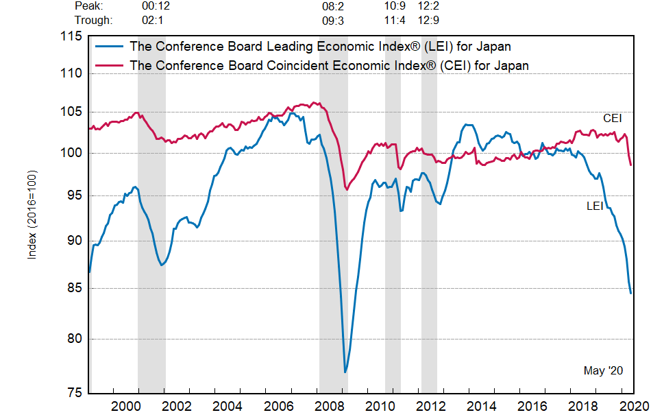 Результаты исследований, опубликованные Conference Board, показали: по итогам мая ведущий экономический индекс (LEI) для Японии упал на 1,4 процента, и составил 84,5 пункта (2016=100). Напомним, индекс зафиксировал снижение на 2,6 процента в апреле и падение на 1,6 процента в марте. В течение шести месяцев (с ноября 2019 по май 2020 года) показатель упал на 7,2 процента после снижения на 6,5 процента за предыдущий шестимесячный период (с октября 2019 года по апрель 2020 года).