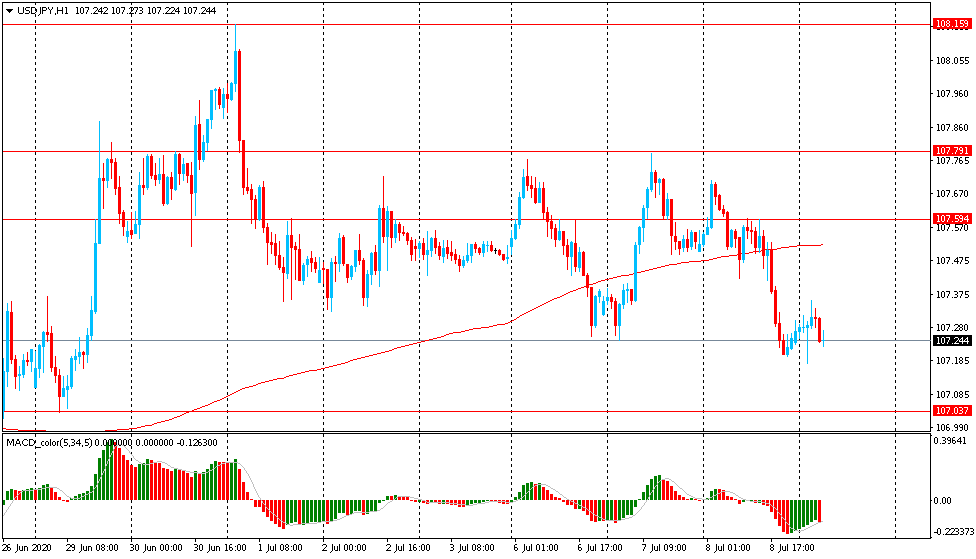 Вчера пара USD/JPY торговалась с понижением и закрыла день в красной зоне около цены Y107.25. Сегодня пара торговалась в узком диапазоне Y107.20-35, оставаясь вблизи вчерашней цены закрытия. На часовом графике USD/JPY пробила и закрепилась ниже линии скользящей средней МА (200) Н1 (Y107.50). На четырехчасовом графике ситуация аналогичная. Исходя из вышесказанного, вероятно, стоит придерживаться южного направления в торговле и пока пара остается ниже MA 200 H1, необходимо искать точки входа на продажу на формирование коррекции.