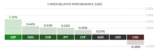 По итогам недели почти все основные валюты продемонстрировали повышение. Наибольший прирост по отношению к доллару США показал британский фунт (+1,18%). Меньшее повышение зафиксировали новозеландский доллар (+0,64%), евро (+0,53%), японская иена (+0,52%), швейцарский франк (+0,35%) и австралийский доллар (+0,07%). Снизился только канадский доллар (-0,38%)
