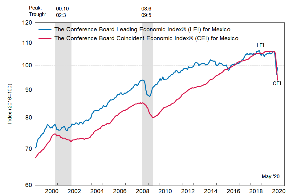 Результаты исследований, опубликованные Conference Board, показали: по итогам мая ведущий экономический индекс (LEI) для Мексики вырос на 2,9 процента, и составил 99,1 пункта (2016=100). Напомним, индекс зафиксировал снижение на 5,2 процента в апреле и падение на 3,5 процента в марте. В течение шести месяцев (с ноября 2019 по май 2020 года) показатель упал на 6,0 процента после снижения на 8,4 процента за предыдущий шестимесячный период (с октября 2019 года по апрель 2020 года).