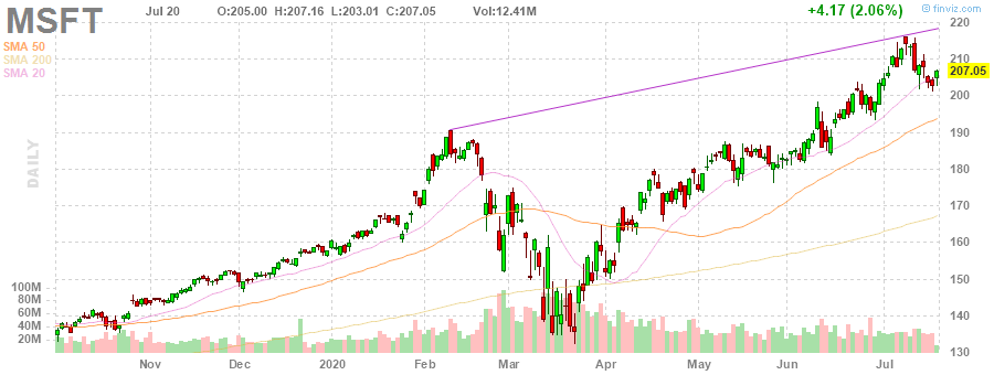Как отмечает Barron’s, стоимость акций Microsoft (MSFT) повысилась до нового максимума в период пандемии Covid-19, поскольку компании ускоряют внедрение облачного программного обеспечения. Это дало толчок как Azure, общедоступному облачному сервису компании, так и облачным приложениям, таким как Office 365 и Teams.
