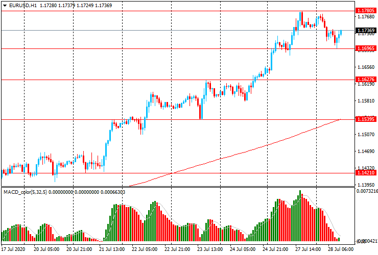 ЕUR/USD: пара торгуется в основном со снижением в диапазоне $1.1696-1.1770, после достижения вчера максимума с конца сентября 2018 года ($1.1780).