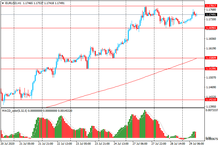 ЕUR/USD: пара торгуется с незначительным ростом и остается в рамках вчерашнего диапазона $1.1696-1.1770, после достижения в понедельник максимума с конца сентября 2018 года ($1.1780).