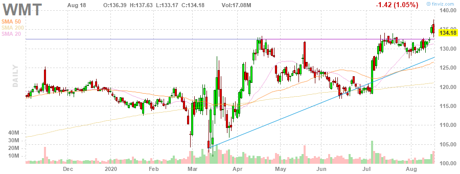 На текущий момент акции WMT котируются по $134.18 (-1.05%).