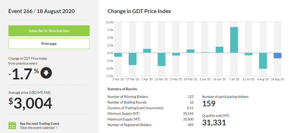 Как стало известно, стоимость молочной продукции упала на 1,7%, до $3 004 за метрическую тонну после того, как снизилась на 5,1% в ходе предыдущего аукциона. Результаты аукциона также показали, что стоимость цельного сухого молока снизилась на 2,2%, составив $2 936 за метрическую тонну после того, как упала на 7,5% в ходе предыдущего аукциона. Тем временем, цена обезжиренного сухого молока выросла на 1,1%, до $2 608 за метрическую тонну после того, как упала на 4,6% в ходе предыдущего аукциона.