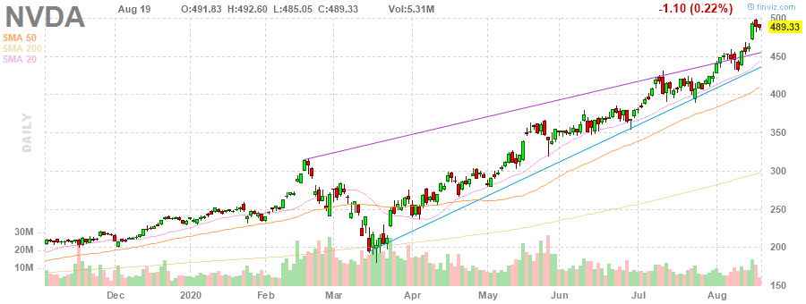 Инвесторы, которые уже владеют акциями, с нетерпением ожидают услышать о потенциалах роста компании от ее генерального директора и других менеджеров. Самым значительным событием должен стать запуск производства графических процессоров Nvidia нового поколения на архитектуре Ampere, которые, как ожидается, будут представлены 1 сентября, - через 21 год после выпуска первого графического процессора.