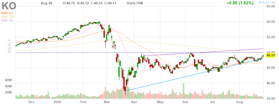 На текущий момент акции KO котируются по $49.11 (+1.82%).