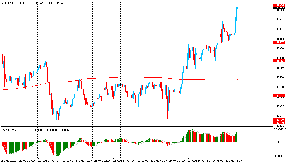 Вчера пара EUR/USD торговалась с повышением и закрыла день на положительной территории около цены $1.1935. Сегодня пара также немного выросла, поднявшись к отметке $1.1990. На часовом графике EUR/USD все еще торгуется выше линии скользящей средней МА (200) Н1 ($1.1845). На четырехчасовом графике ситуация аналогичная. Исходя из вышесказанного, вероятно, стоит придерживаться северного направления в торговле и пока пара остается выше MA 200 H1, необходимо искать точки входа на покупку на формирование коррекции.