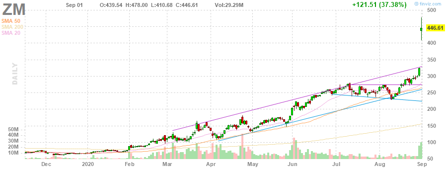 На текущий момент акции ZM котируются по $446.61 (+37.38%).