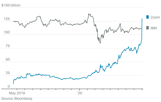 Стоимость акций ZM в моменте составляет $447, что предполагает, что они с начала года подорожали примерно на 556%. Рыночная капитализация Zoom сейчас составляет примерно $125 млрд., что делает ее дороже IBM (IBM)!