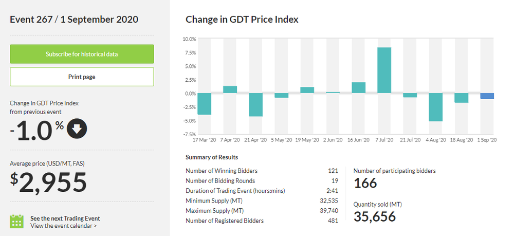 Как стало известно, стоимость молочной продукции упала на 1,0%, до $2 955 за метрическую тонну после того, как снизилась на 1,7% в ходе предыдущего аукциона. Результаты аукциона также показали, что стоимость цельного сухого молока снизилась на 2,0%, составив $2 884 за метрическую тонну после того, как упала на 2,2% в ходе предыдущего аукциона. Тем временем, цена обезжиренного сухого молока увеличилась на 1,8%, до $2 663 за метрическую тонну после того, как выросла на 1,1% в ходе предыдущего аукциона.