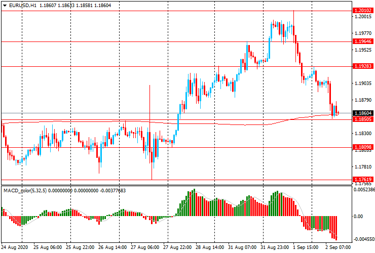 ЕUR/USD: пара продолжает вчерашнее снижение и пытается пробить линию скользящей средней MA (200) H1 ($1.1860).