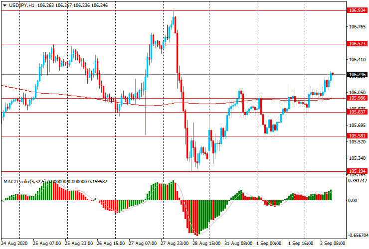 USD/JPY: пара продолжает вчерашний рост и выросла с Y105.85 до Y106.30, пробив линии скользящей средней МА (200) Н1 (Y106.00) и МА (200) Н4 (Y106.00).