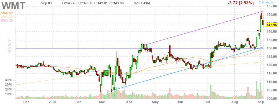 На текущий момент акции WMT котируются по $143.96 (-2.52%).