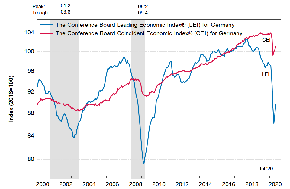 Результаты исследований, опубликованные Conference Board, показали: по итогам июля ведущий экономический индекс (LEI) для Германии вырос на 2,3 процента, и составил 89,6 пункта (2016=100). Напомним, индекс зафиксировал повышение на 1,6 процента в июне и снижение на 3,1 процента в мае. В течение шести месяцев (с января по июль 2020 года) показатель упал на 7,9 процента после снижения на 10,1 процента за предыдущий шестимесячный период (с декабря 2019 года по июнь 2020 года).