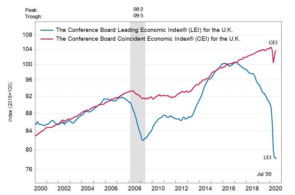 Результаты исследований, опубликованные Conference Board, показали: по итогам июля ведущий экономический индекс (LEI) для Великобритании снизился на 0,3 процента, и составил 78,2 пункта (2016=100). Напомним, индекс зафиксировал нулевое изменение в июне и падение на 2,2 процента в мае. В течение шести месяцев (с января по июль 2020 года) показатель упал на 13,2 процента после снижения на 13,4 процента за предыдущий шестимесячный период (с декабря 2019 года по июнь 2020 года).