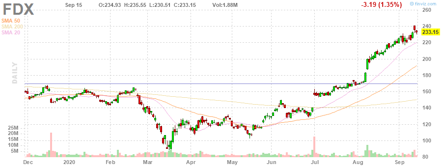 Как отмечает Barron’s, ситуация с акциями FedEx (FDX) улучшилась в последнее время, так как серия повышений их рейтингов и целевой стоимости аналитиками способствовали росту спроса на них.