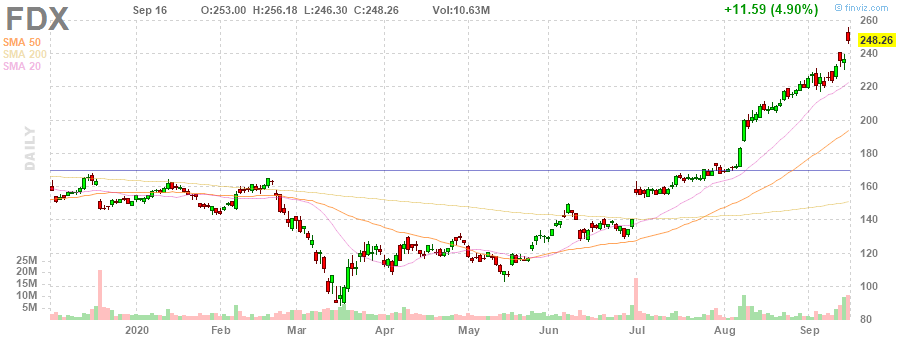 На текущий момент акции FDX котируются по $248.26 (+4.90%).