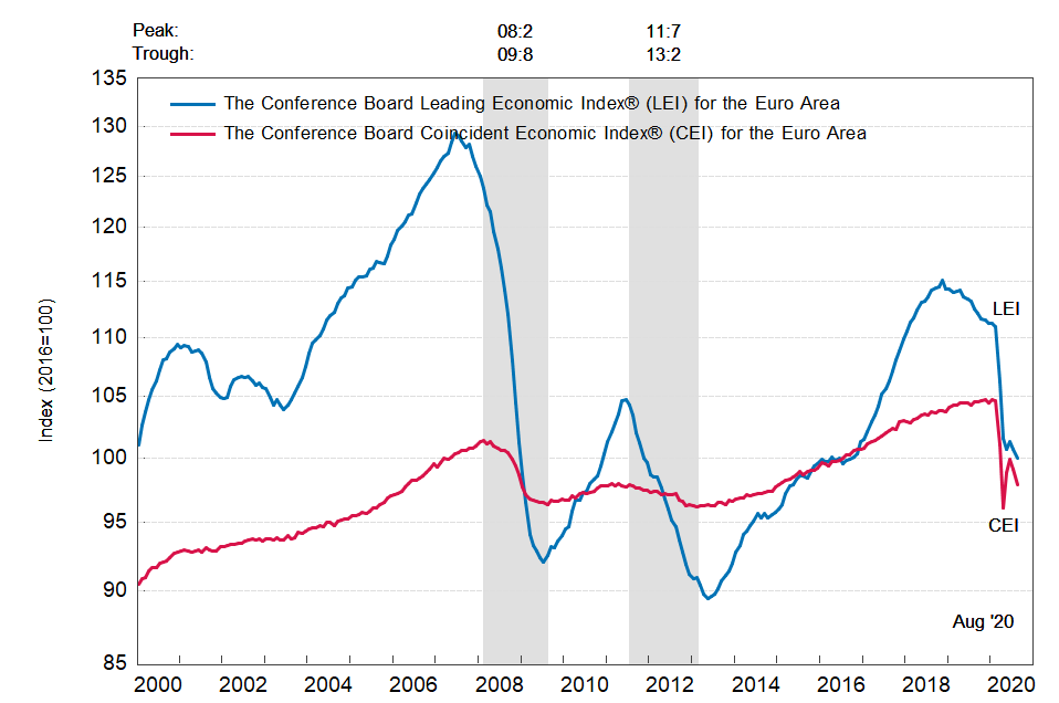 Результаты исследований, опубликованные Conference Board, показали: по итогам августа ведущий экономический индекс (LEI) для еврозоны упал на 0,7 процента, и составил 100,0 пункта (2016=100). Напомним, индекс зафиксировал снижение на 0,6 процента в июле и увеличение на 0,6 процента в июне. В течение шести месяцев (с февраля по август 2020 года) показатель упал на 9,8 процента после снижения на 9,4 процента за предыдущий шестимесячный период (с января по июль 2020 года).
