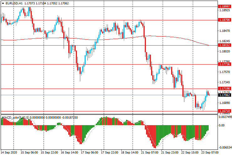 ЕUR/USD: с начала торгов пара снизилась с $1.1710 до почти двухмесячного минимума $1.1670, но вскоре вернула все утраченных позиций и выросла к $1.1720.