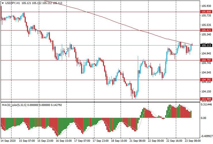 USD/JPY: пара торгуется в диапазоне Y104.90-105.20 - около недельного максимума и тестирует линию скользящей средней МА (200) Н1 (Y105.10).