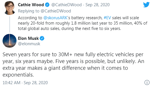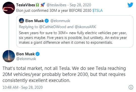Маск дал несколько цифр в Twitter: “Лет семь однозначно до 30 миллионов "плюс" новых полностью электрических транспортных средств в год, может быть, шесть лет," - написал Маск. "Пять лет возможно, но маловероятно. Когда дело доходит до экспонент, дополнительный год имеет огромное значение".
