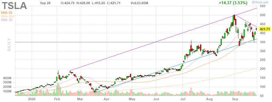 На текущий момент акции TSLA котируются по $421.71 (+3.53%).