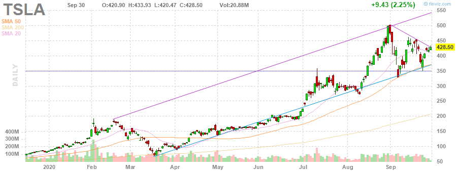 На текущий момент акции TSLA котируются по $428.50 (+2.25%).