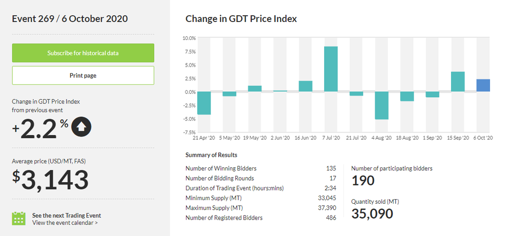Как стало известно, стоимость молочной продукции выросла на 2,2%, до $3 143 за метрическую тонну после того, как поднялась на 3,6% в ходе предыдущего аукциона. Результаты аукциона также показали, что стоимость цельного сухого молока выросла на 1,7%, составив $3 041 за метрическую тонну после того, как увеличилась на 3,2% в ходе предыдущего аукциона. Тем временем, цена обезжиренного сухого молока упала на 0,9%, до $2 865 за метрическую тонну после того, как выросла на 8,4% в ходе предыдущего аукциона.
