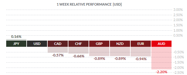 По итогам недели почти все основные валюты продемонстрировали снижение. Наибольший спад по отношению к доллару США показал австралийский доллар (-2,20%). Меньшее падение зафиксировали евро (-0,94%), британский фунт (-0,89%), новозеландский доллар (-0,89%), швейцарский франк (-0,66%) и канадский доллар (-0,57%). Выросла только японская иена (+0,16%).