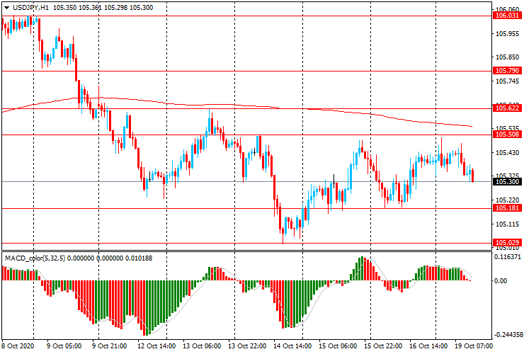 USD/JPY: пара торгуется в основном со снижением в диапазоне Y105.30-50 и остается ниже линии скользящей средней МА (200) Н1 (Y105.55).