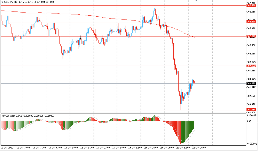 Вчера пара USD/JPY торговалась с понижением и закрыла день в красной зоне около цены Y104.55. Сегодня пара наоборот немного выросла, поднявшись к отметке Y104.70. На часовом графике USD/JPY все еще торгуется ниже линии скользящей средней МА (200) Н1 (Y105.30). На четырехчасовом графике ситуация аналогичная. Исходя из вышесказанного, вероятно, стоит придерживаться южного направления в торговле и пока пара остается ниже MA 200 H1, необходимо искать точки входа на продажу на формирование коррекции.