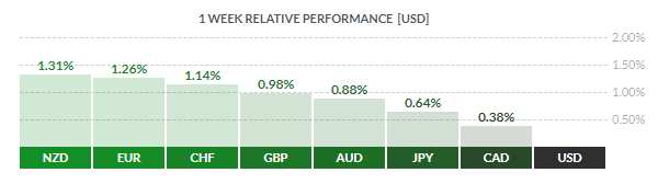 По итогам недели все основные валюты продемонстрировали повышение. Наибольший прирост по отношению к доллару США показал новозеландский доллар (+1,31%). Меньшее повышение зафиксировали евро (+1,26%), швейцарский франк (+1,14%), британский фунт (+0,98%), австралийский доллар (+0,88%), японская иена (+0,64%) и канадский доллар (+0,38%)