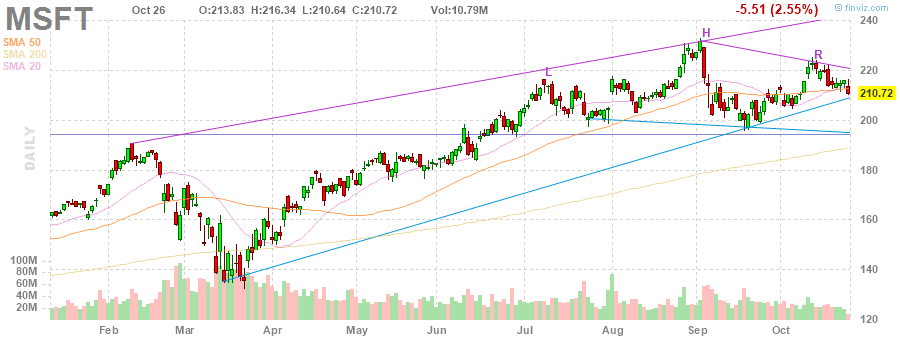 На текущий момент акции MSFT котируются по $210.72 (-2.55%).