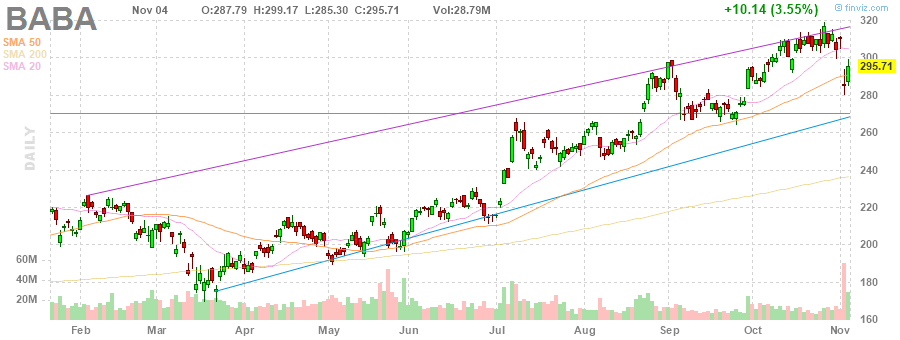 Акции BABA на премаркете снизились до уровня $291.59 (-1.39%).