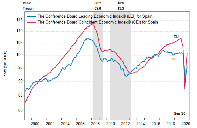 Результаты исследований, опубликованные Conference Board, показали: по итогам сентября ведущий экономический индекс (LEI) для Испании вырос на 1,2 процента, и составил 95,4 пункта (2016=100). Напомним, индекс зафиксировал повышение на 2,1 процента в августе и увеличение на 2,7 процента в июле. В течение шести месяцев (с марта по сентябрь 2020 года) показатель упал на 3,2 процента после снижения на 6,3 процента за предыдущий шестимесячный период (с февраля по август 2020 года).