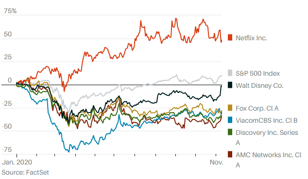 Компании-аналоги Disney из медиа-сегмента показали худшие результаты: стоимость акций ViacomCBS (VIAC), Fox Corp. (FOXA) и Discovery (DISCA) в этом году снизилась как минимум на 25%. Между тем акции сервиса потокового видео Netflix (NFLX) с начала года подорожали почти на 50%.