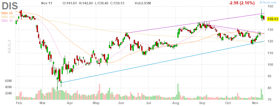 На текущий момент акции DIS котируются по $139.13 (-2.10%).