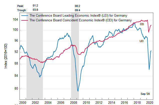 Результаты исследований, опубликованные Conference Board, показали: по итогам сентября ведущий экономический индекс (LEI) для Германии вырос на 0,2 процента, и составил 92,5 пункта (2016=100). Напомним, индекс зафиксировал повышение на 2,4 процента в августе и увеличение на 2,9 процента в июле. В течение шести месяцев (с марта по сентябрь 2020 года) показатель упал на 1,0 процента после снижения на 4,9 процента за предыдущий шестимесячный период (с февраля по август 2020 года).
