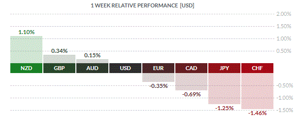 По итогам недели большинство основных валют продемонстрировали снижение. Наибольший спад по отношению к доллару США показал швейцарский франк (-1,46%). Меньшее падение зафиксировали японская иена (-1,25%), канадский доллар (-0,69%) и евро (-0,35%). Повышение показали новозеландский доллар (+1,10%), британский фунт (+0,34%) и австралийский доллар (+0,15%)