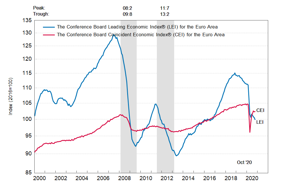 Результаты исследований, опубликованные Conference Board, показали: по итогам октября ведущий экономический индекс (LEI) для еврозоны упал на 0,6 процента, и составил 99,9 пункта (2016=100). Напомним, индекс зафиксировал снижение на 0,3 процента в сентябре и падение на 0,4 процента в августе. В течение шести месяцев (с апреля по октябрь 2020 года) показатель упал на 1,6 процента после снижения на 5,4 процента за предыдущий шестимесячный период (с марта по сентябрь 2020 года).